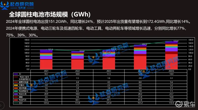 据起点研究发布的2024中国圆柱电池TOP20排行榜显示,2024年全球圆柱电池出货151.2GWh,同比增长24%;预计2025年出货量有望增长到172.4GWh,同比增长14%。